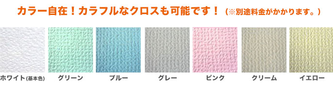 基本色はホワイトですが、グリーン、ブルー、グレー、ピンク、クリーム、イエロー(下記サンプル参考)に関しまして別途料金が発生しますが、色の変更可能です。